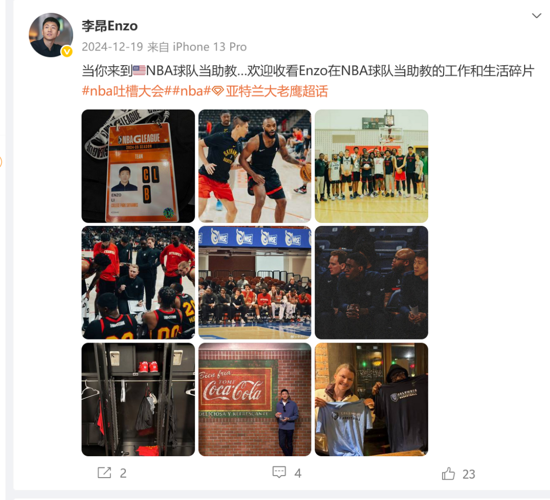 4、2024年签约NBA亚特兰大老鹰队下属球队科利奇帕克天鹰队,成为NBA发展联盟首位中国教练,负责球员个人训练、对手球探报告及防守策略设计。